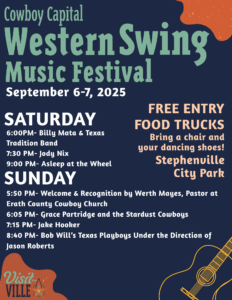 Bring a chair and your dancing shoes! We can’t wait to have you out for the 2nd annual Cowboy Capital Western Swing Music Festival!!